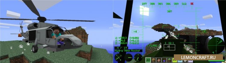 С модом MC Helicopter можно создать целый авиапарк в своем мире майнкрафт. С установкой этого мода будут добавлены различные самолеты и вертолеты. Все машины будут доступны для полетов, а также неплохо вооружены. Теперь вы сможете нападать на своих врагов с воздуха. Летать можно не только днем, но и ночью. Вся техника снабжена приборами ночного виденья. Крафт не очень дорогой, и вы сможете насладится полетами в самом начале игры.